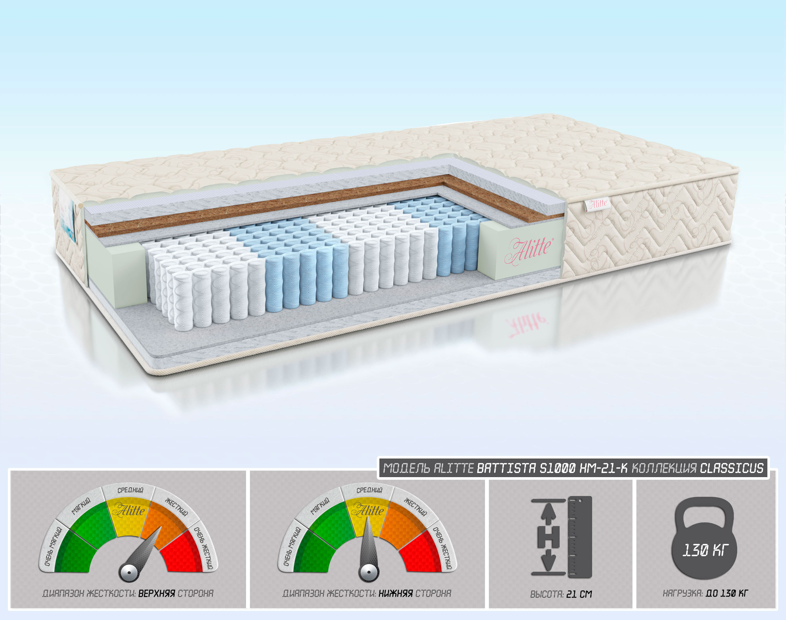 | Наполнение | Hollcon-3/Cocos-1/войлок/S1000-14(5 зон)/войлок/Hollcon-3 | |