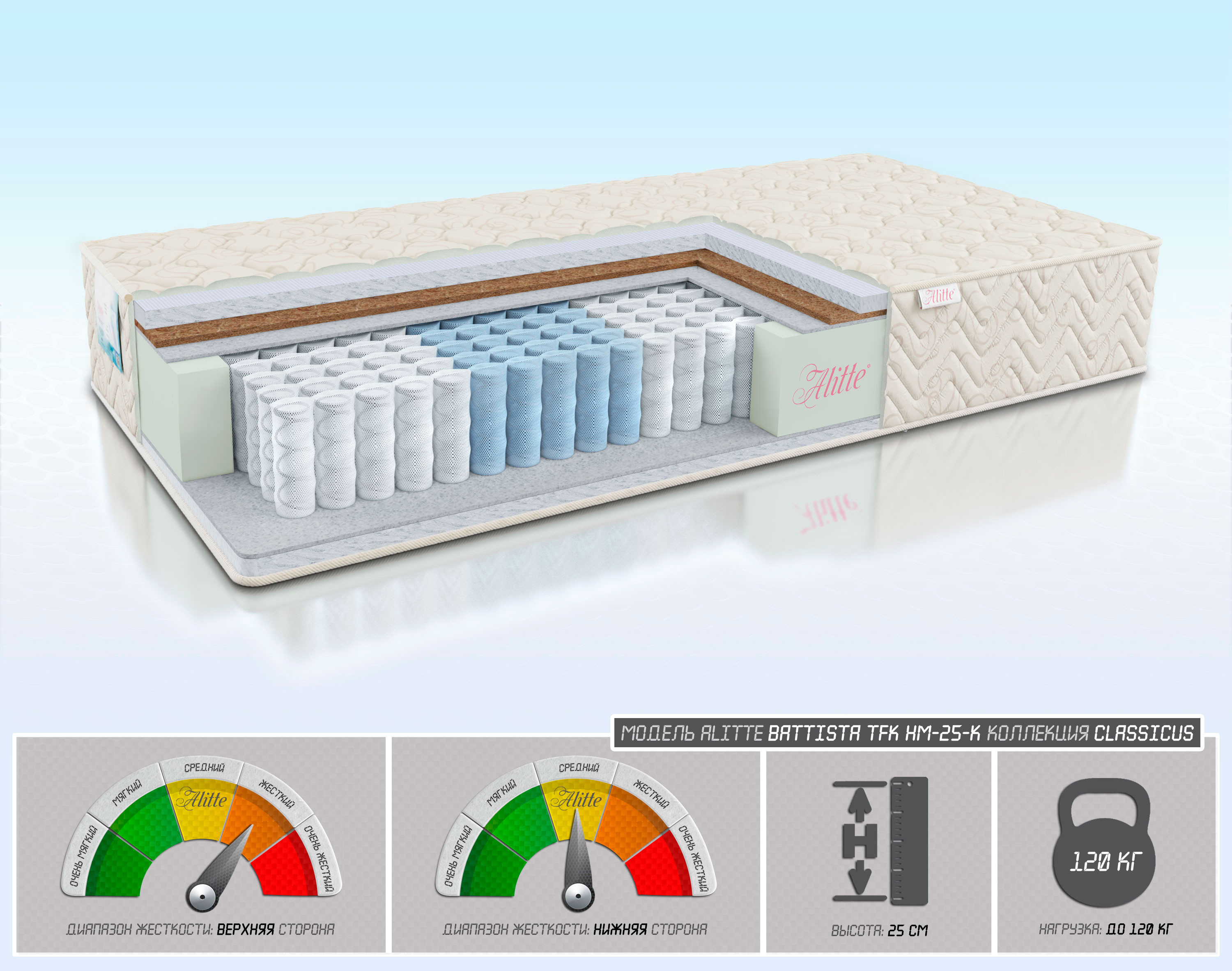 | Наполнение | Hollcon-3/Cocos-1/войлок/TFK-18(5 зон)/войлок/Hollcon-3 | |