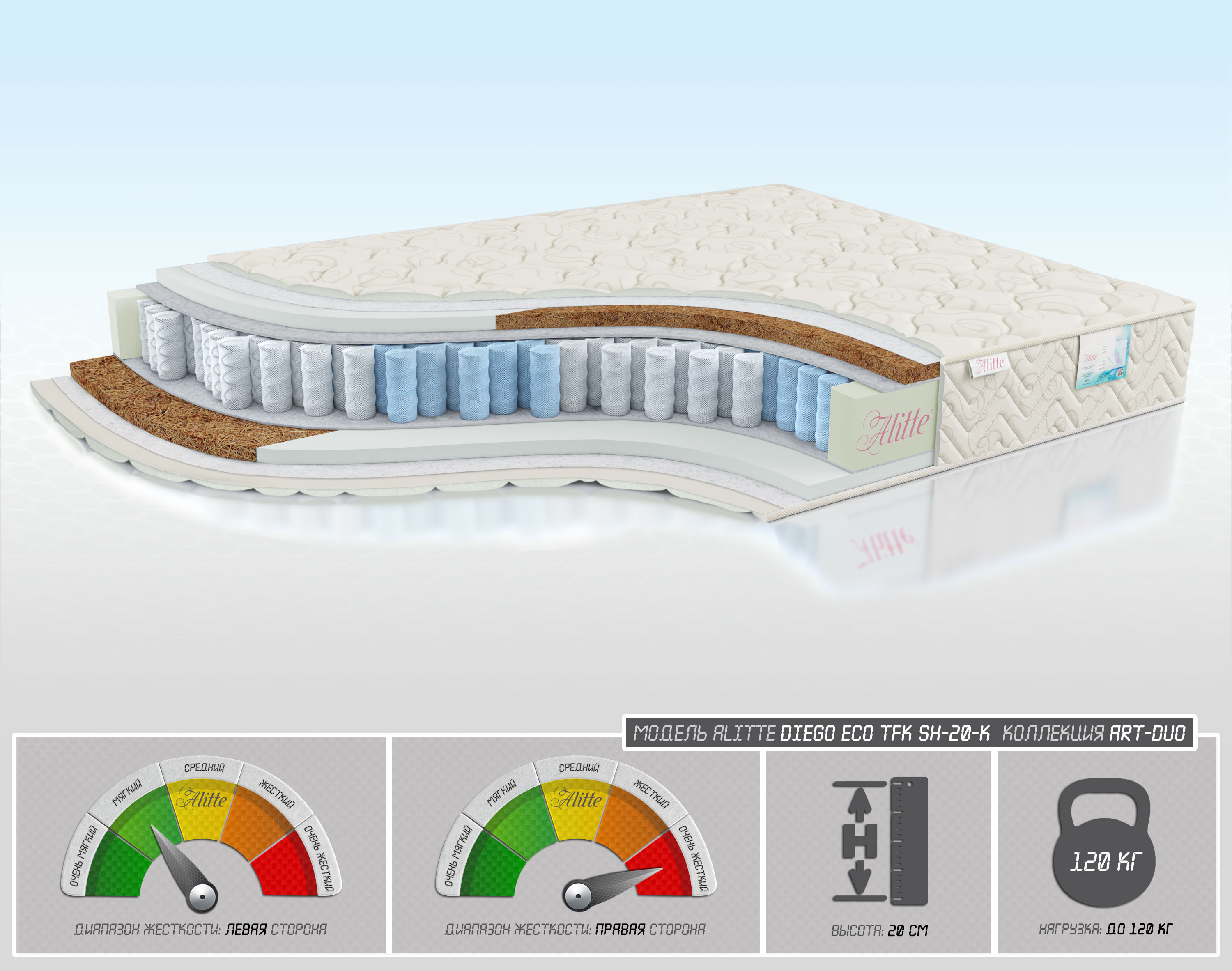 | Наполнение | • Льняное полотно • ППУ – 3 см / Кокос-3 см • Войлок • Пружинный блок TFK (5 зон)- 14 см • Войлок • Кокос – 3 см / ППУ-3 см • Льняное полотно | |