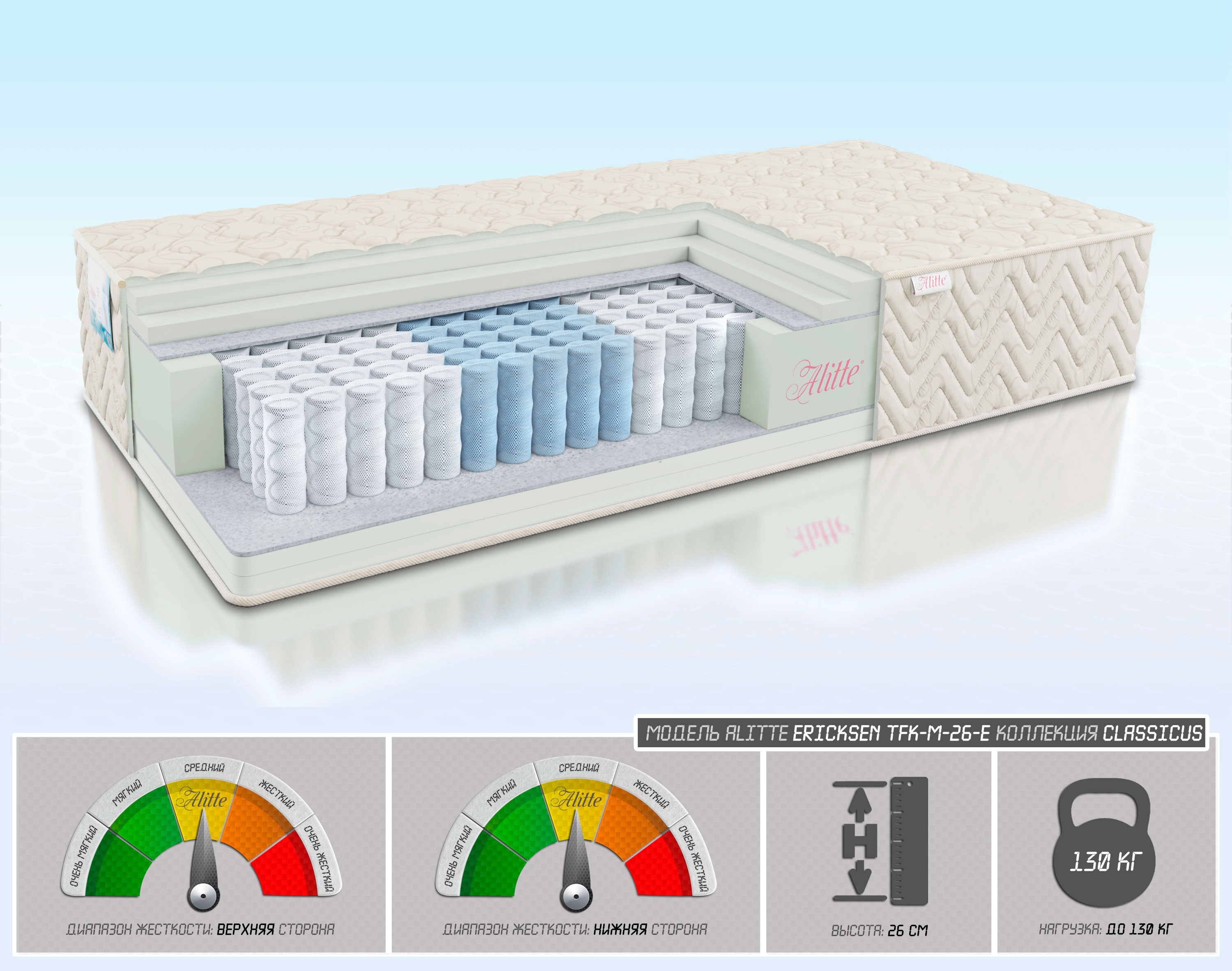 | Наполнение | Latex-Foam-3/Latex-Foam-3/войлок/TFK-14(5 зон)/войлок/Latex-Foam-3/Latex-Foam-3 | |