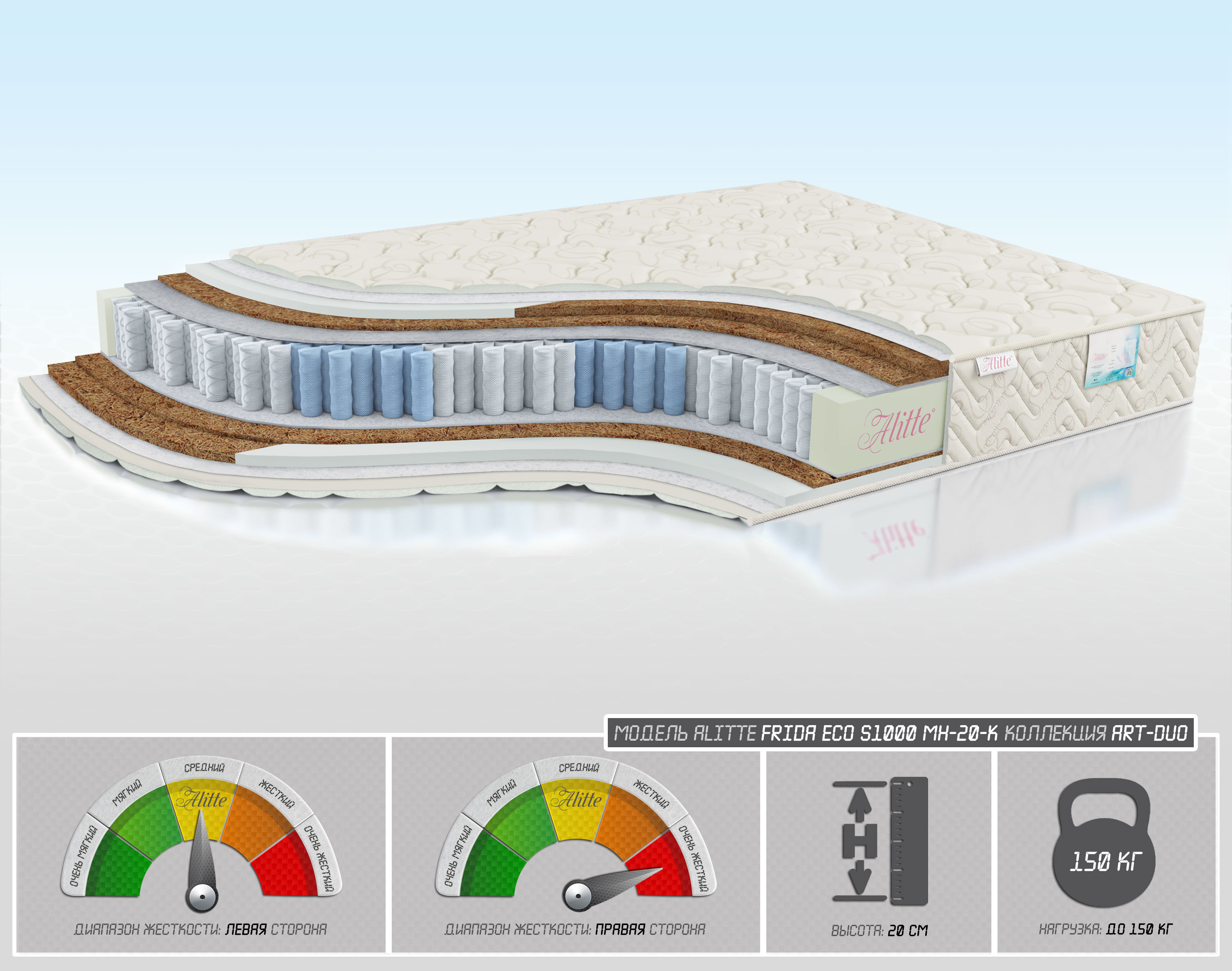 | Наполнение | • Льняное полотно • ППУ-2 см / Кокос-2 см • Кокос -1 • Войлок • Пружинный блок S1000 (7 зон) - 14 см • Войлок • Кокос -1 • Кокос-2 см / ппу-2 см • Льняное полотно | |