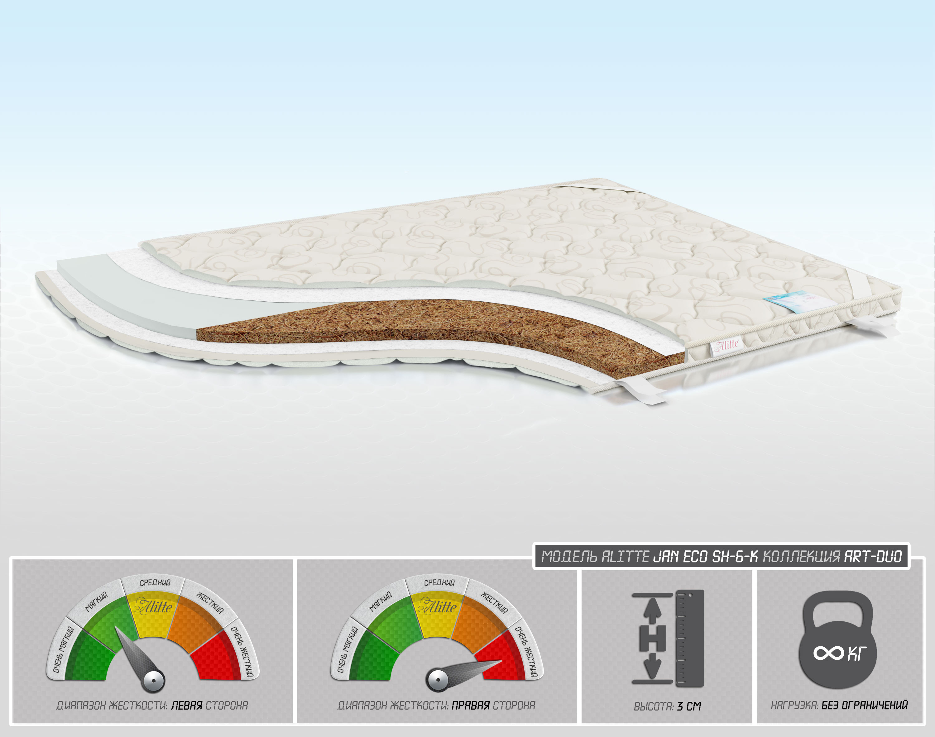 | Наполнение | • Льняное полотно • ППУ – 3 см / Кокос-3 см • Льняное полотно | |