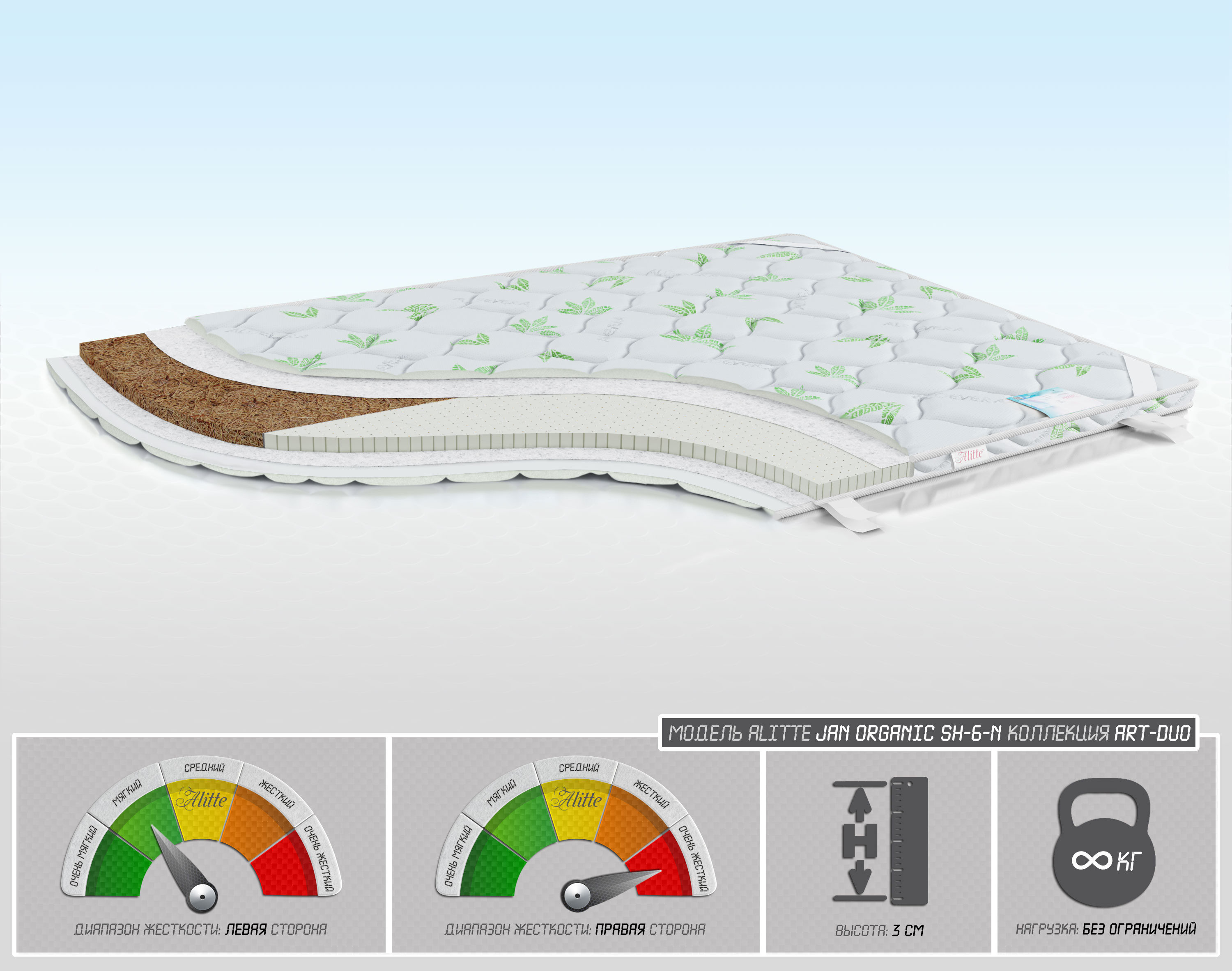 | Наполнение | • Льняное полотно • Кокос – 3 см / Латекс-3 см • Льняное полотно | |