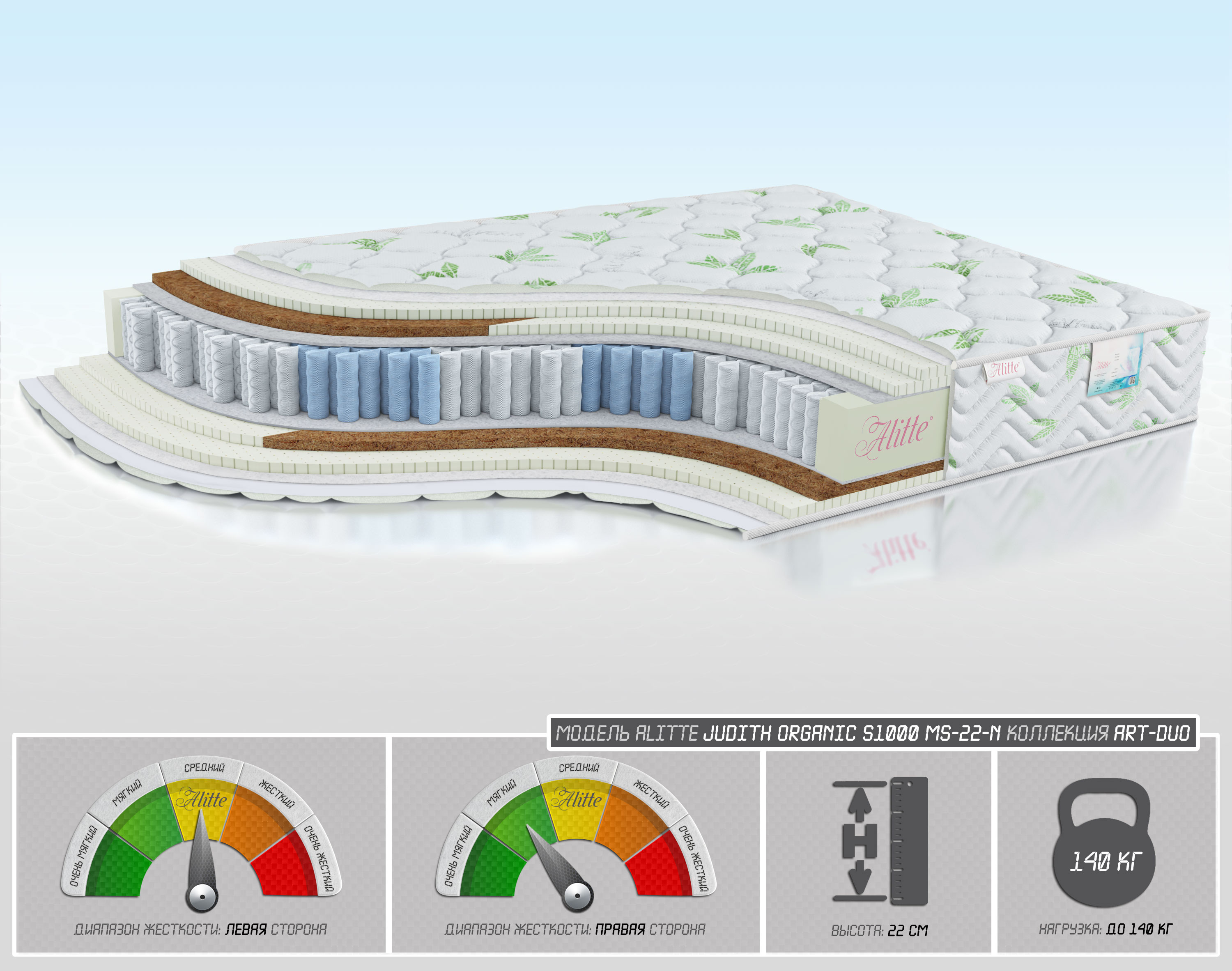 | Наполнение | • Льняное полотно • Латекс-2см • Латекс -2 см /Кокос-2 см • Войлок • Пружинный блок S1000 (7 зон) - 14 см • Войлок • Кокос -2 см / Латекс-2 см • Латекс-2 см • Льняное полотно | |