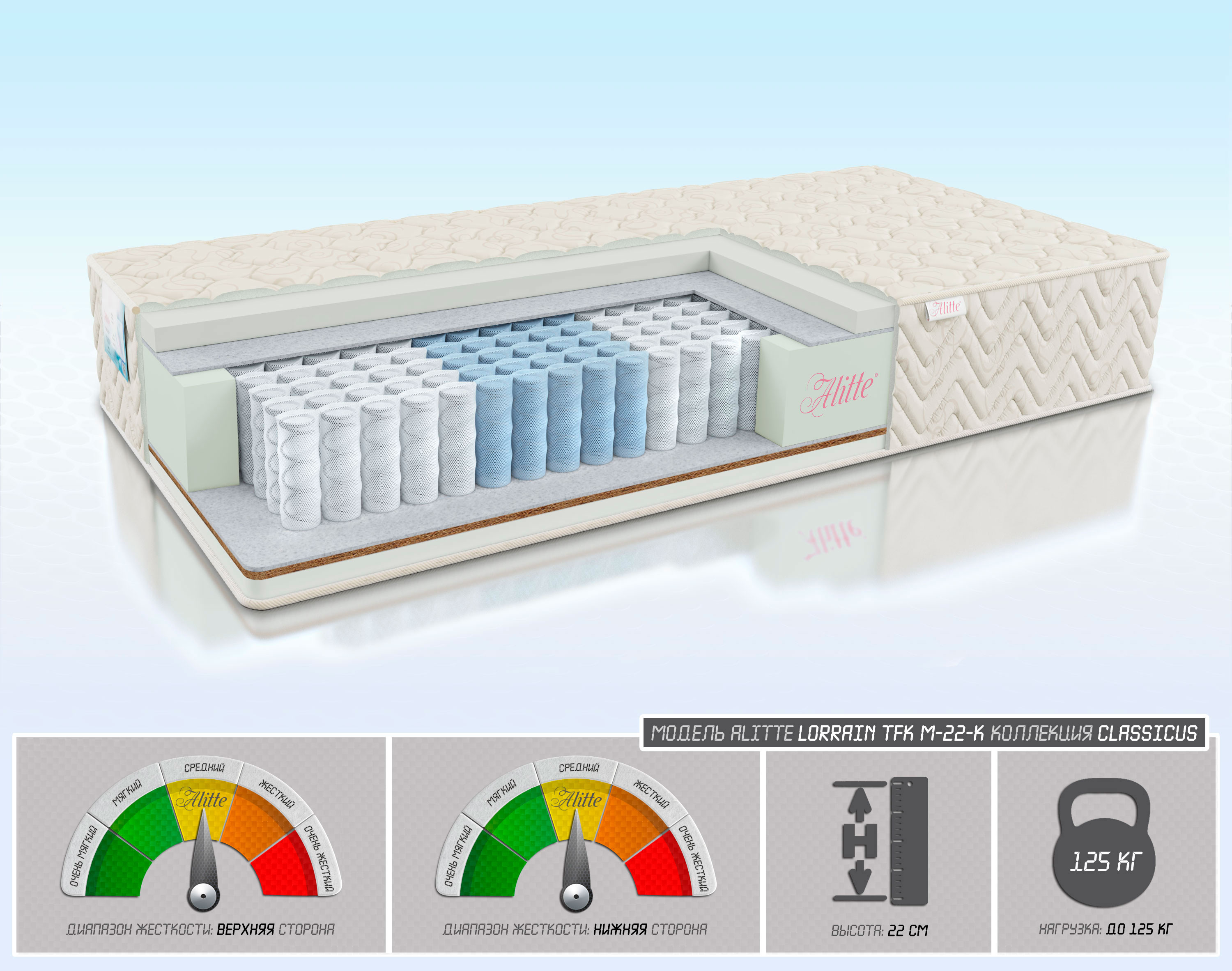 | Наполнение | Latex-Foamс-4/войлок/TFK-14(5 зон)/войлок/Cocos-1/ Latex-Foam-3 | |