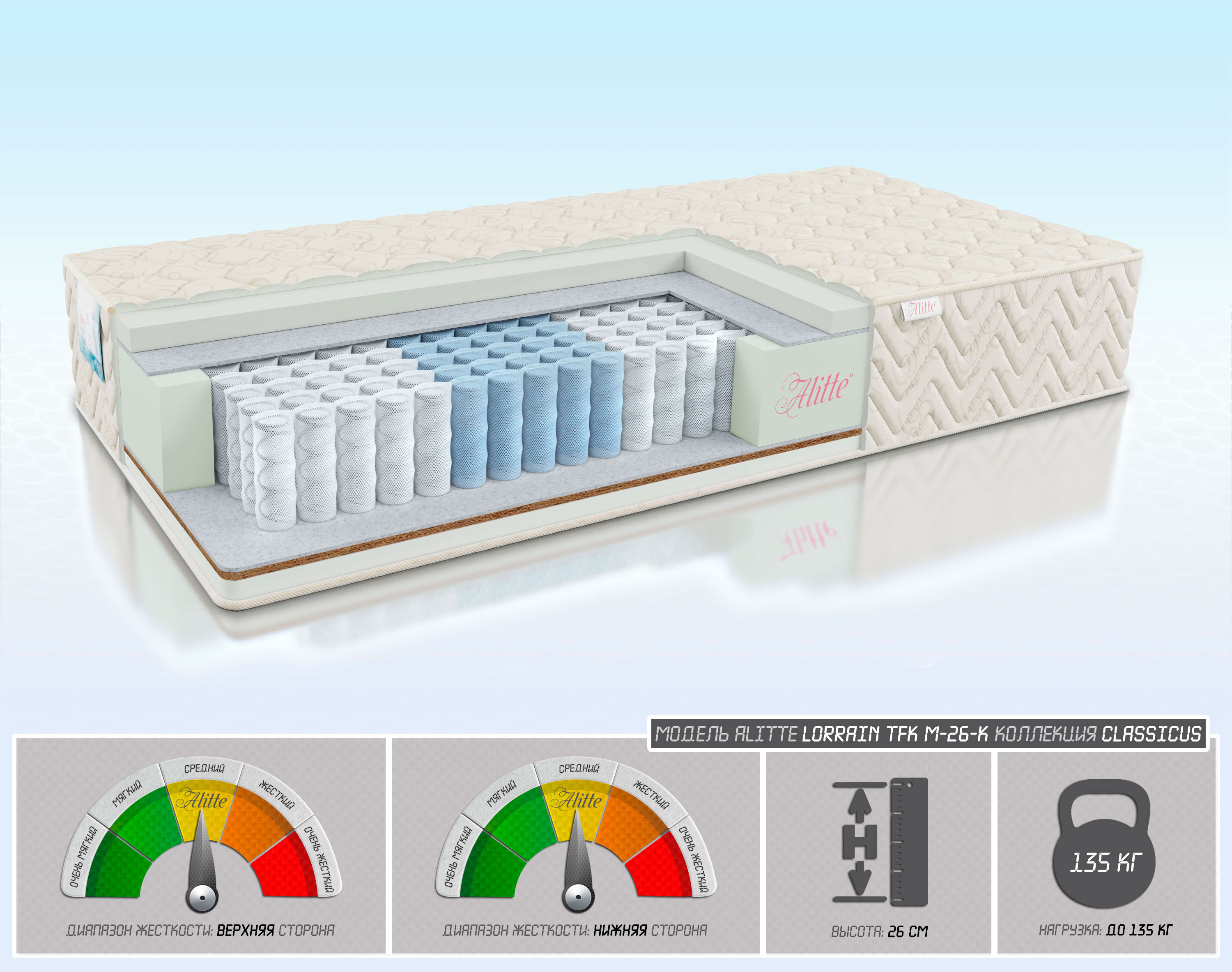| Наполнение | Latex-Foamс-4/войлок/TFK-18(5 зон)/войлок/Cocos-1/ Latex-Foam-3 | |