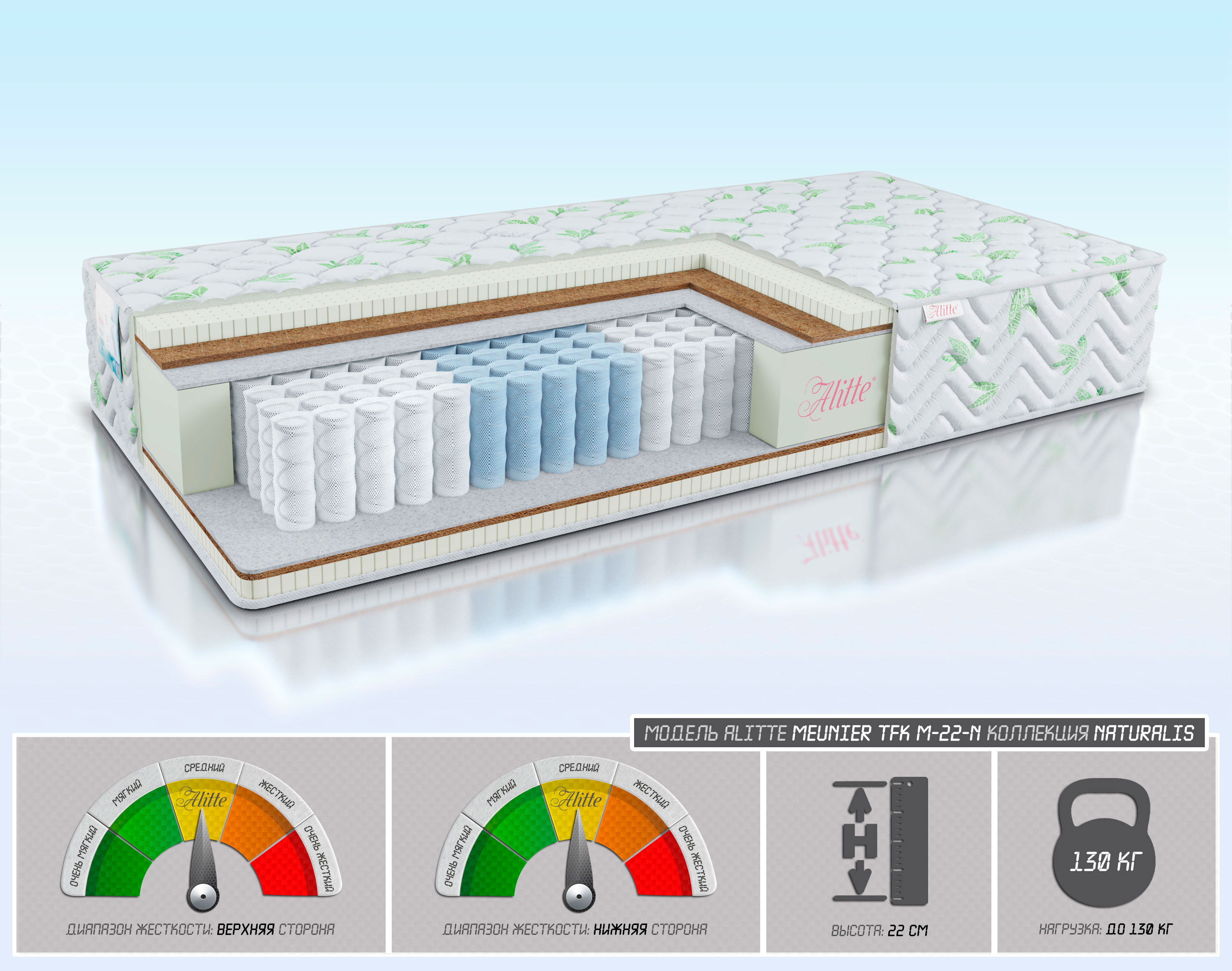| Наполнение | Latex-3/Cocos-1/войлок/TFK-14(5 зон)/ войлок/Cocos-1/Latex-3 | |