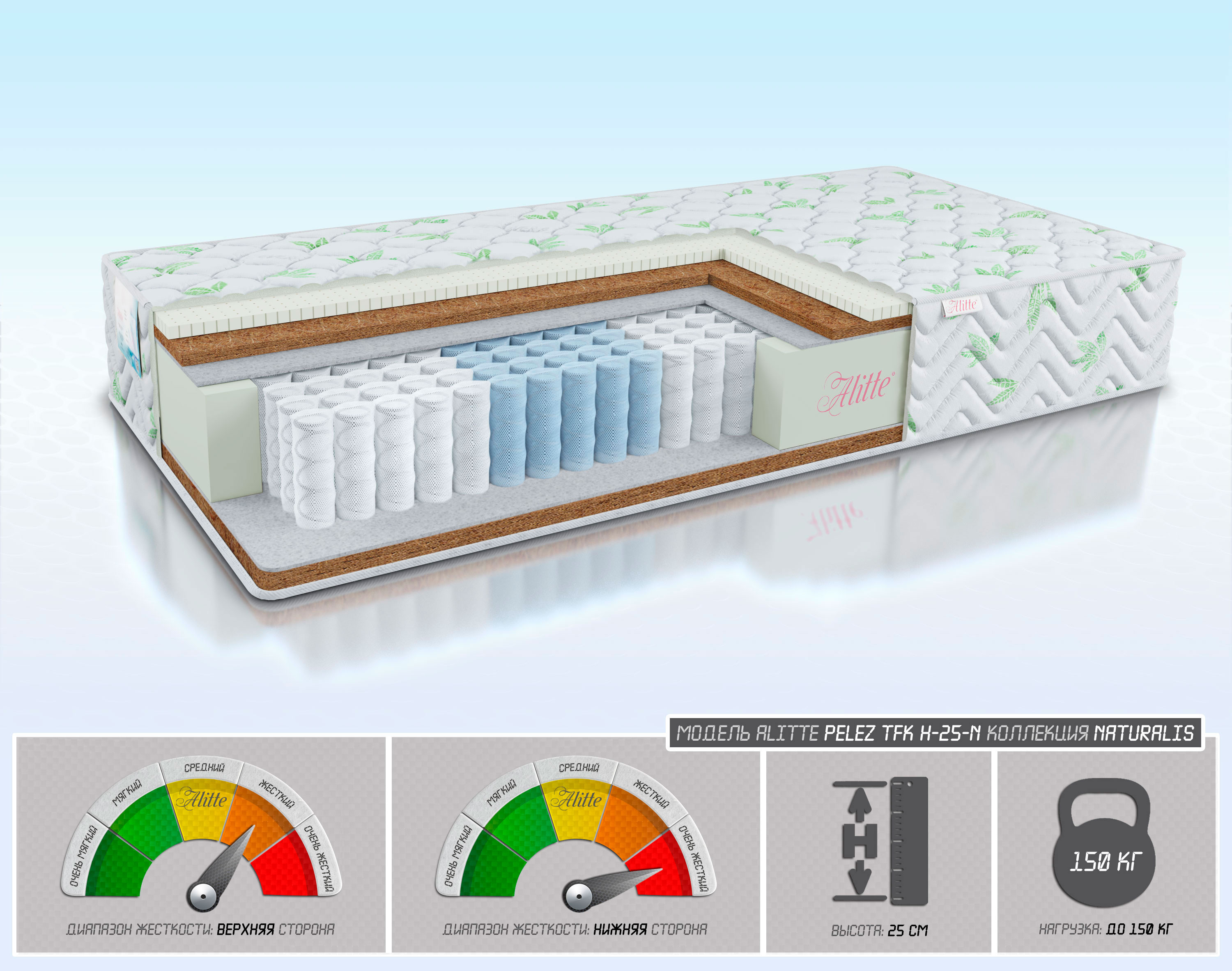 | Наполнение | Latex-2/Cocos-2/войлок/TFK-18(5 зон)/ войлок/Cocos-3 | |